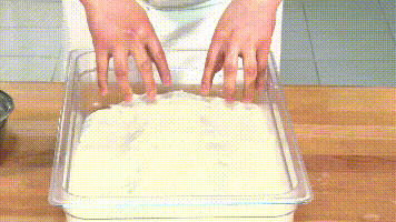 这里要教大家一个小技巧,要夏巴塔翻面前,一定要将手沾水。当手上沾水后,面团就不会粘手。