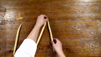 2. 取四条面团将一端相交于一点。