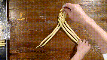 3. 可以将4条面团组成类似于2股辫子的“X”字型,用2股辫的方法进行编制。