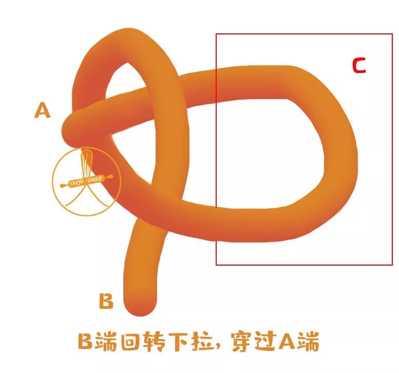 1. 将面团一端弯折,端口按压在1/3节点上,形成一个圆环。
