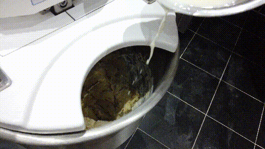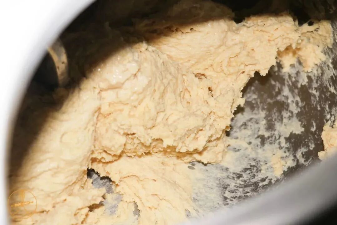 3、快速搅拌,直至面团出现光滑厚膜,中间可用刮板刮缸,由于湿性材料大,刮缸能够帮助湿软的面团快速成型,缩短搅拌时间。
