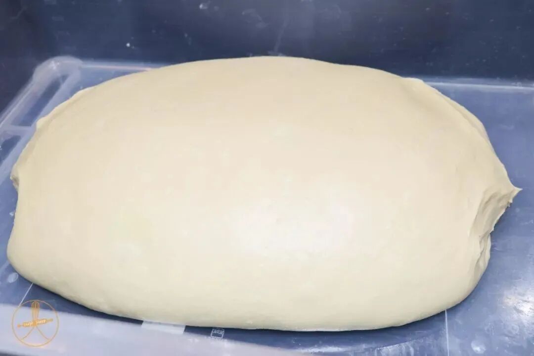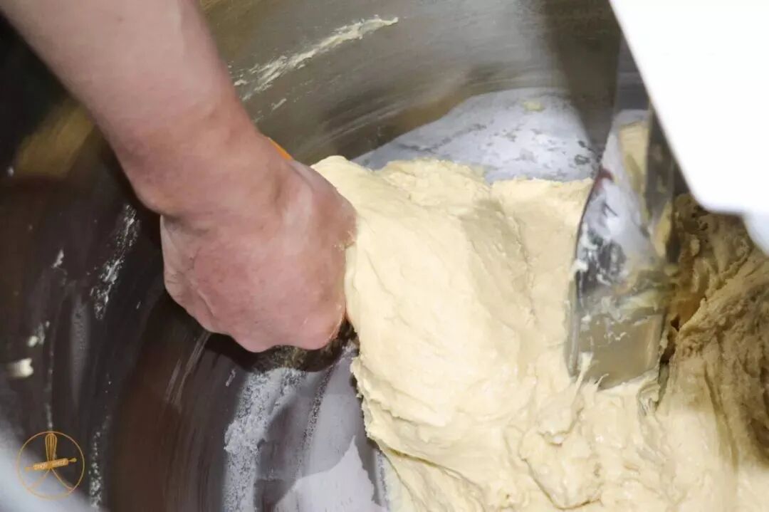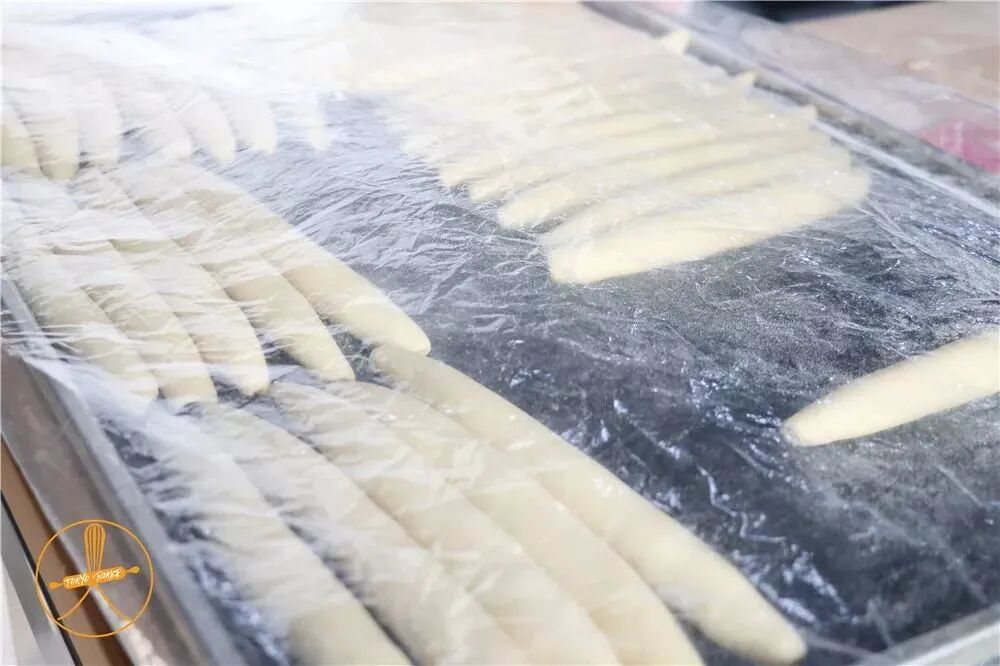 因为面团中含有大量的油脂,所以这一类高油脂面包建议采取隔夜冷藏法,使大量的黄油凝固,更便于操作。