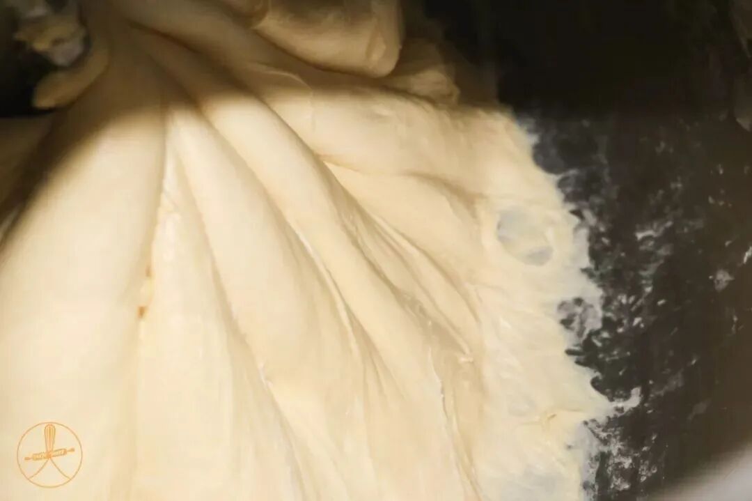 5、快速搅拌,直至面团出现润泽且富有柔软弹性,面团拉开出现光滑薄膜,切勿搅拌过度。