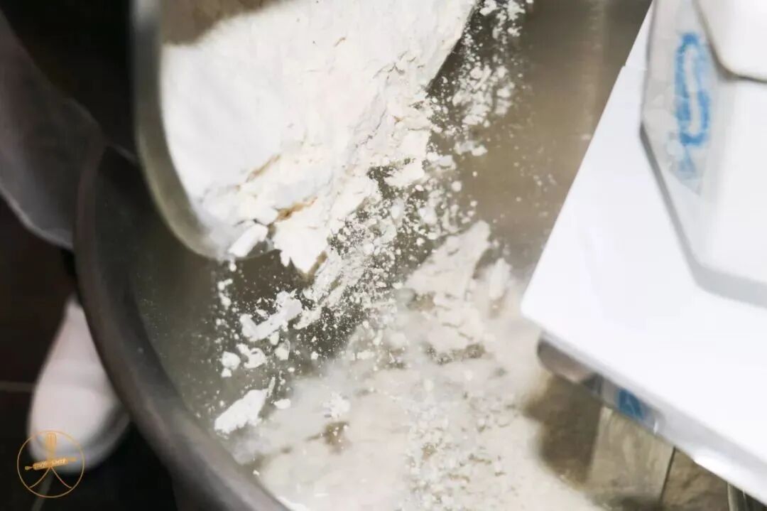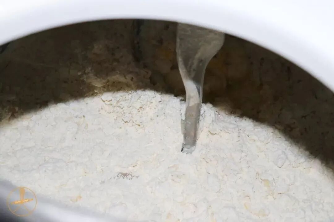 2、慢速搅拌,搅拌至无干粉,面团原料均质且充分吸水。(大约5分钟)。