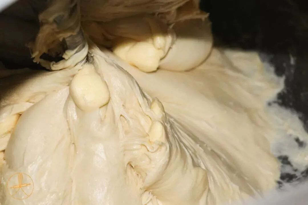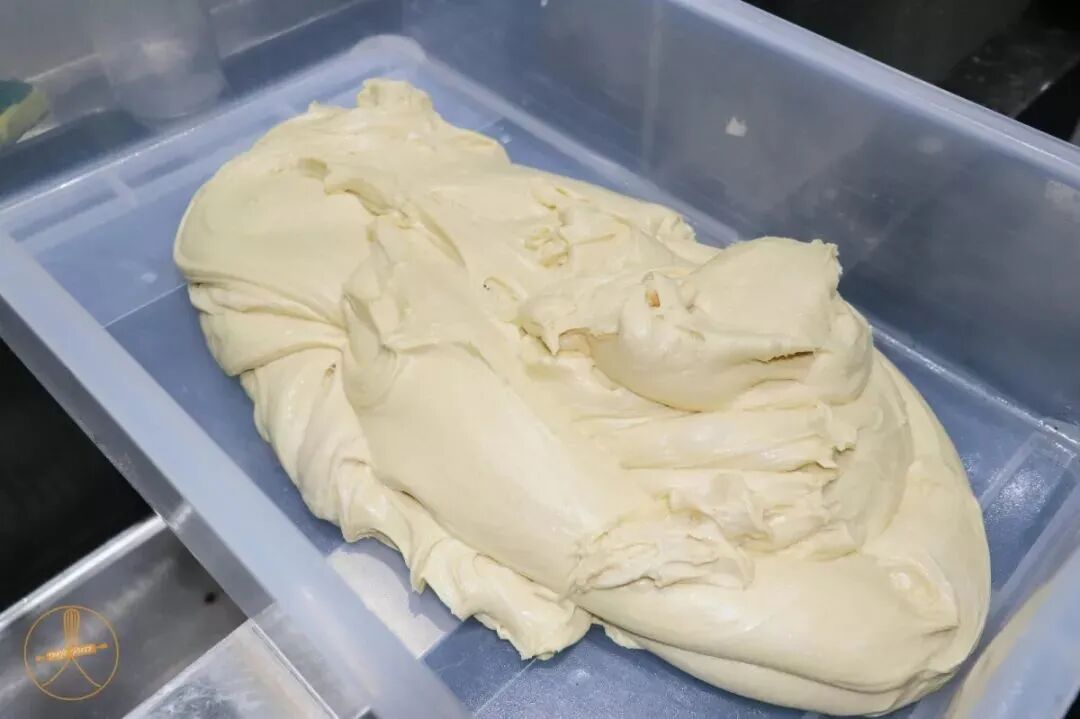 3、黄油分次放入缸中,打至完全扩展。出缸面温应在26摄氏度左右,出缸后直接放入0度冷藏醒发箱。注意:如果面温过低,则需要室温基础发酵30分钟-1小时再放入冷藏醒发箱内。