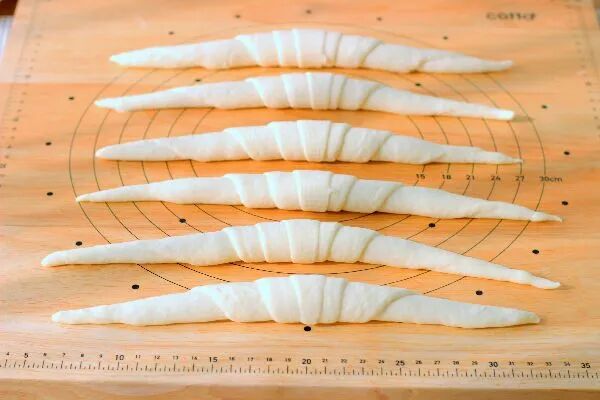 4、整型:将面团擀开,翻面,再擀开,包入30g奶酥酱或者抹茶奶酥酱,卷成橄榄形;