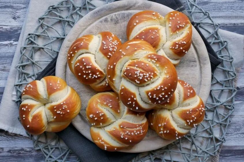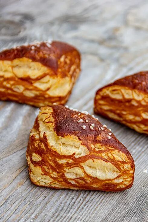 谈起经典德国碱水面包,可能大家立刻就想到这个扭结造型的面包,金棕色又具有光泽的表皮上,被划开的部分露出白色的面包内里,表面撒上一些盐粒装饰。