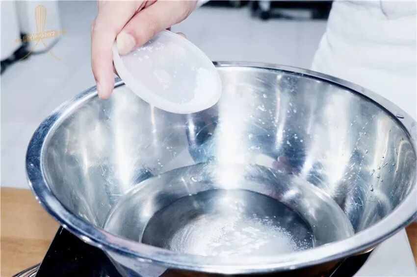 2、制作碱水:在盆中倒入水,再加入烘焙碱,并搅拌均匀,烧开,冷却至常温备用。[碱水危险|请在有防护措施下操作]