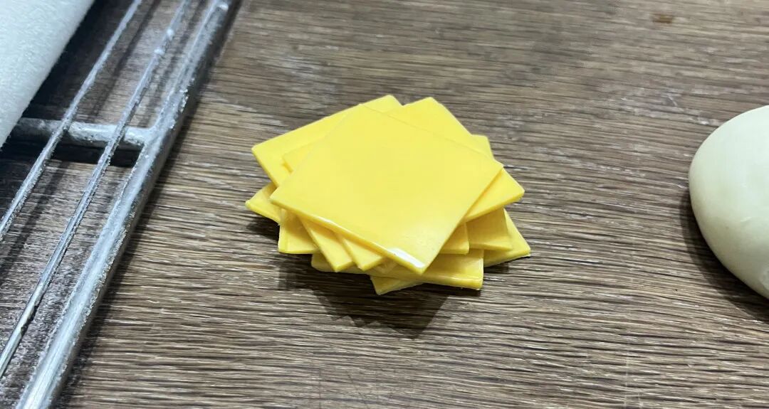 4、整型:将面团拍平,包入25g培根馅,及1/4黄色芝士片;