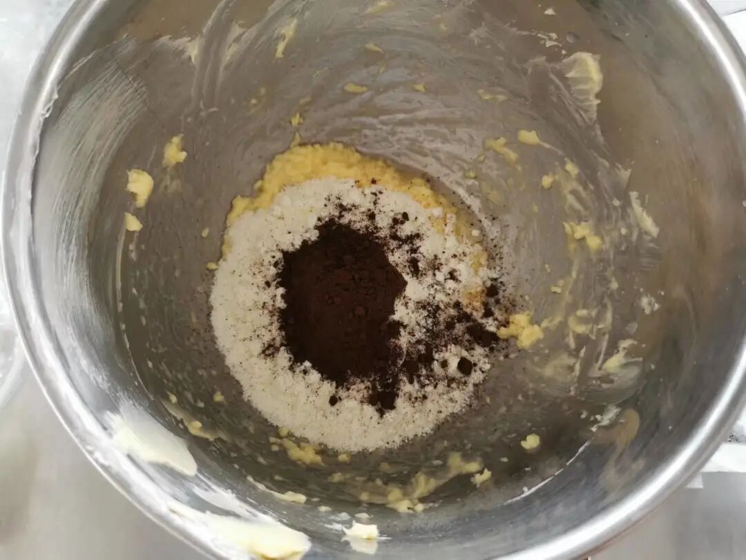 2、加入盐、奶粉和可可粉搅拌均匀。