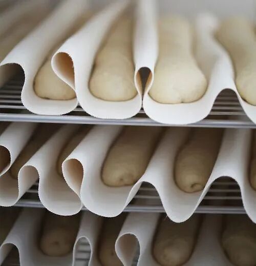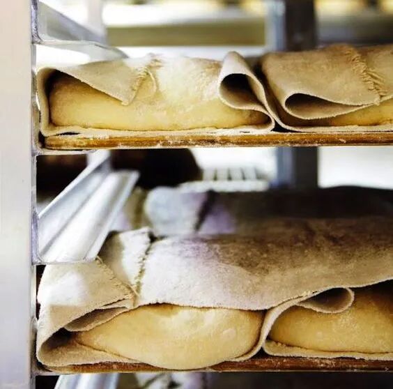 大部分欧包制作中预整形多采用将面团整理成长方形,放于发酵布上,将发酵布折起作为间隔。