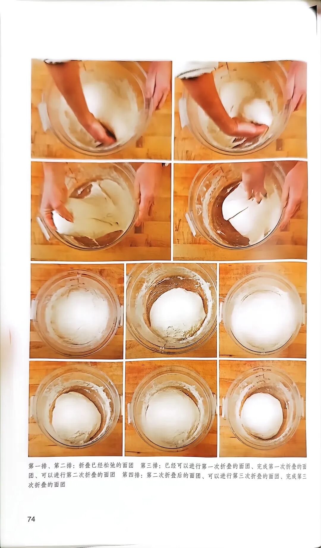 和好的面团折叠3~4次。在面团和好之后的1.5~2小时进行折叠最容易。