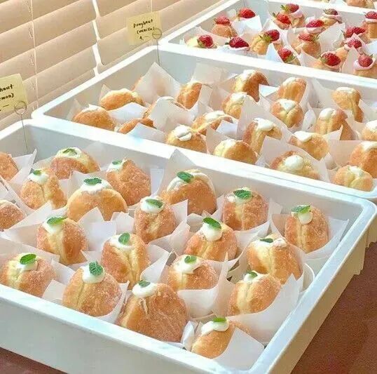 蓬松的面团,挤入满满馅料,表面均匀地撒上糖。夏天放入冰箱里冷藏,冷凉清爽的奶油真的太美味了。