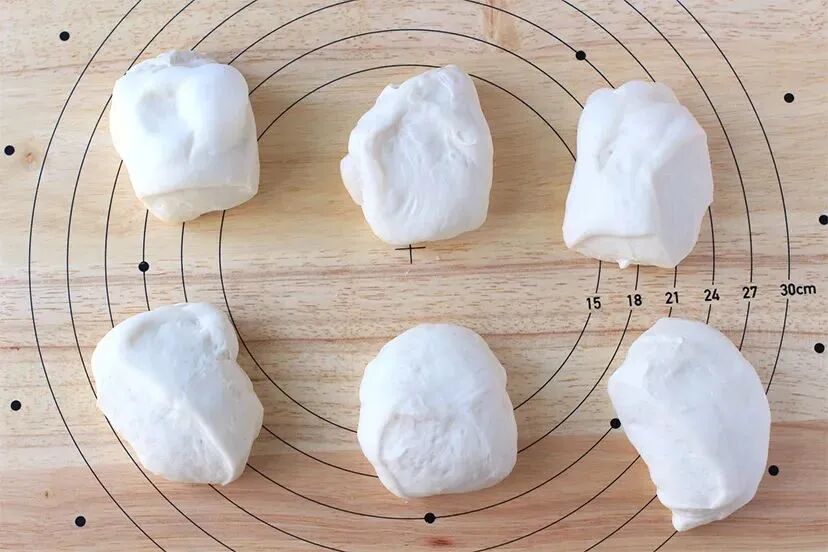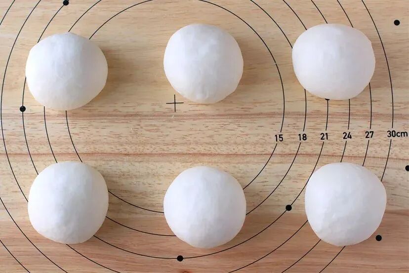 3、分割、揉圆、中间松弛:初次发酵完成,分割面团60克/个。将面团滚圆,盖上保鲜膜,醒发大约10分钟。