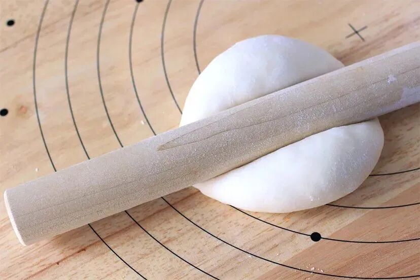 4、成型:轻轻地滚动面团,做最后的整型。在面团和擀面杖上撒一层薄粉,用力在面团中央压一下!一定要用力压,避免二发后压痕太浅。