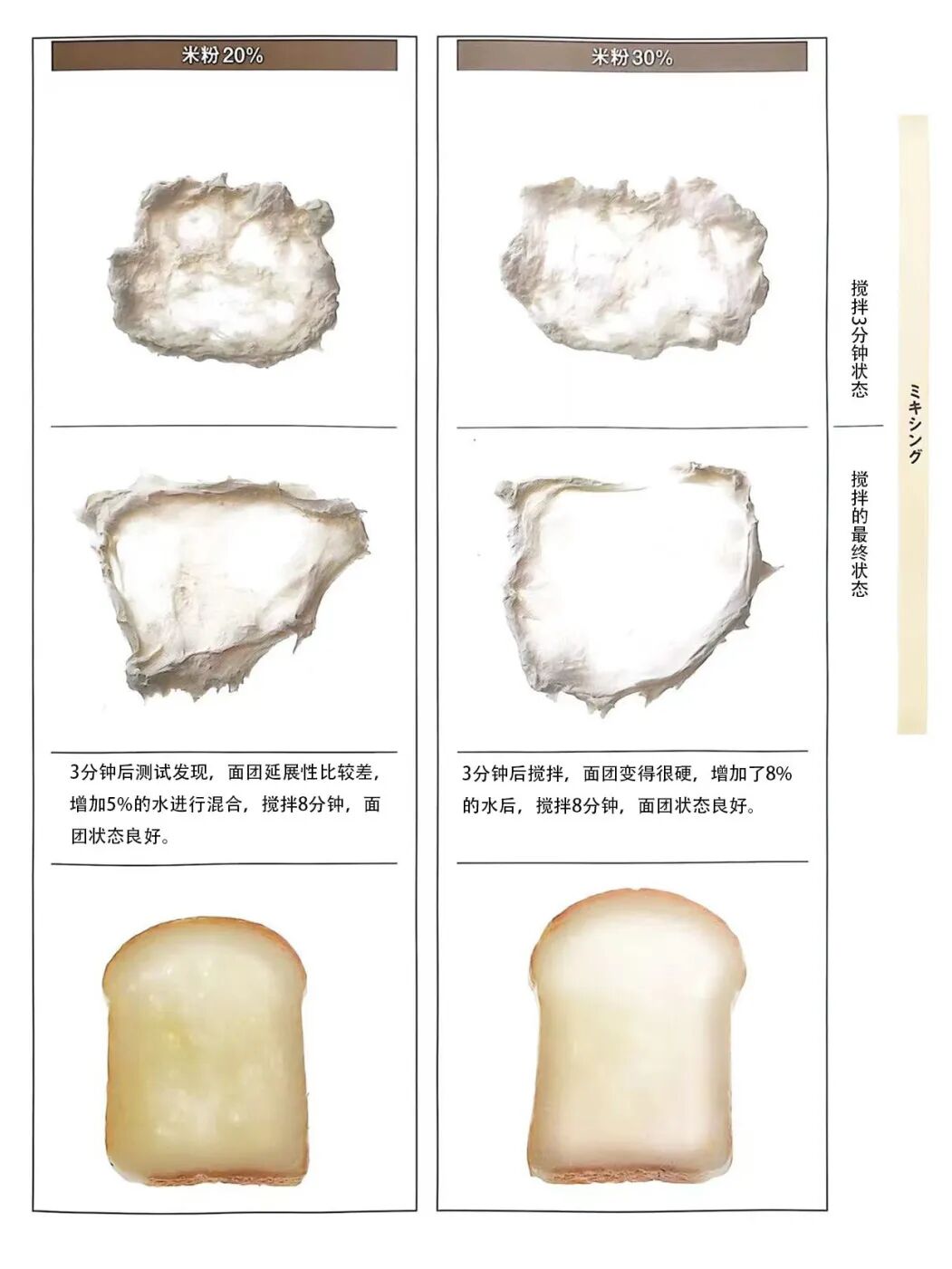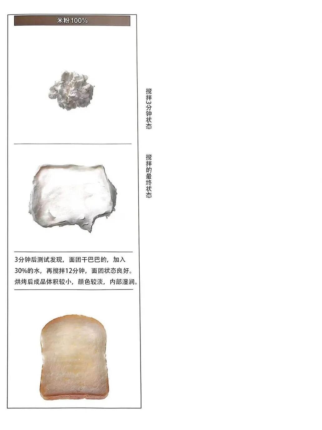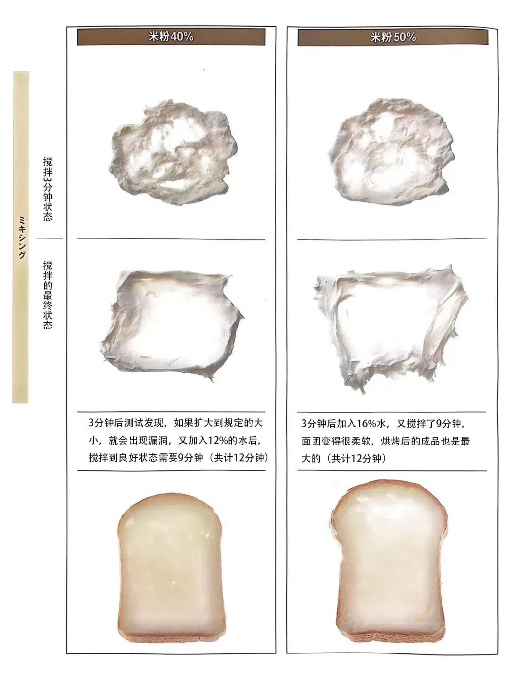 可以看出,米粉的吸水性比小麦粉强,所以在添加米粉时,需要适当增加水量。