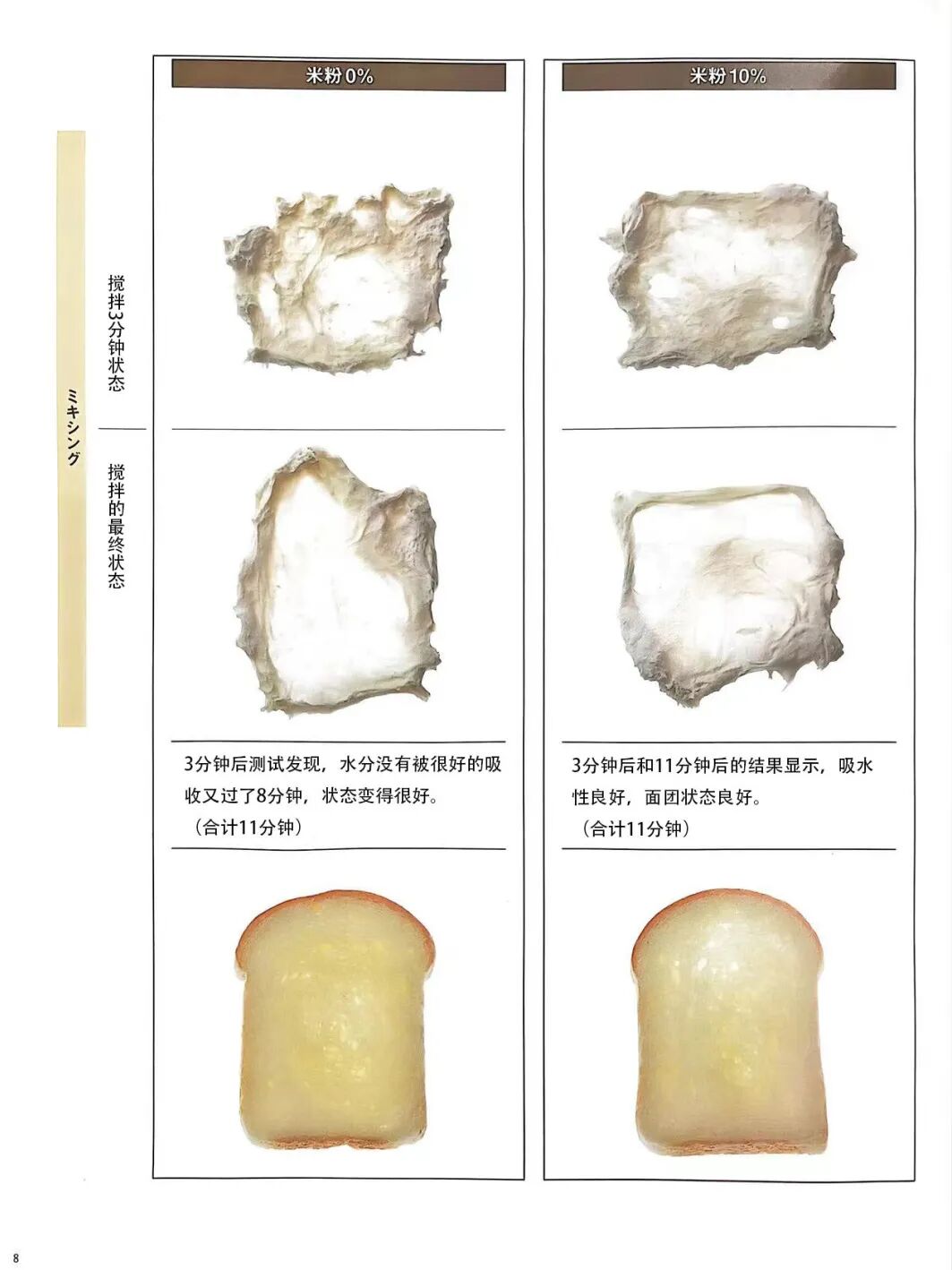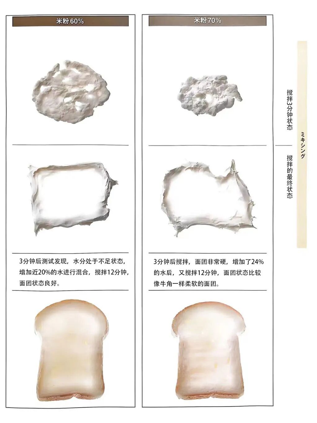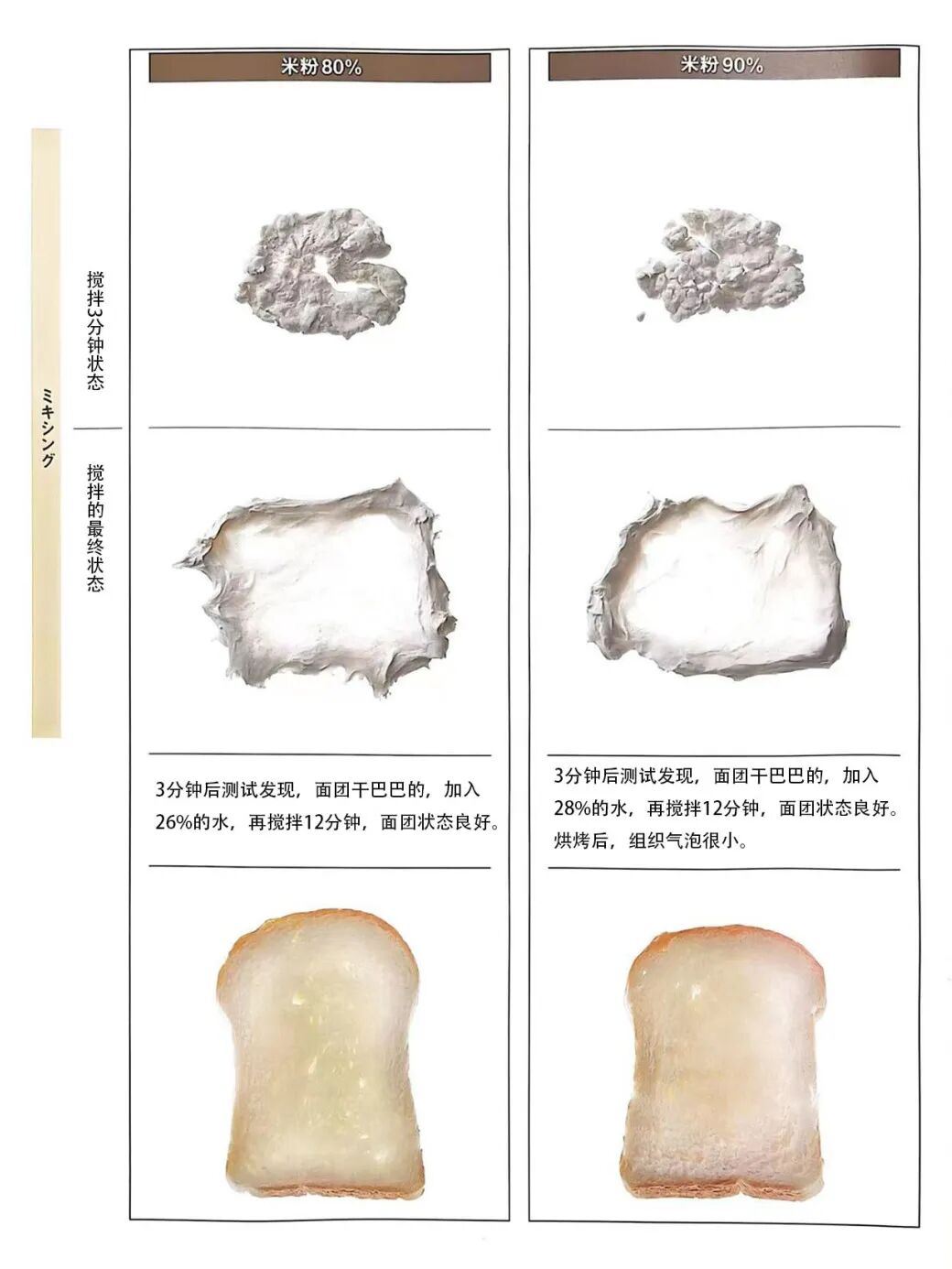 可以看出,米粉的吸水性比小麦粉强,所以在添加米粉时,需要适当增加水量。