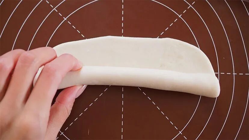 7、松弛好的面团捏细拉长,擀开呈长方形,预先将作为收口处的下方部分擀薄。