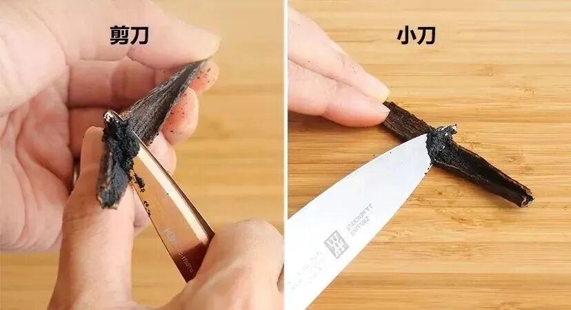 香草荚的正确处理方法是用刀尖把香草荚剖开两半,用刀尖刮出里边的香草籽使用。