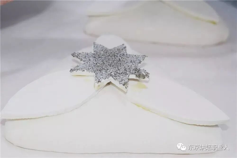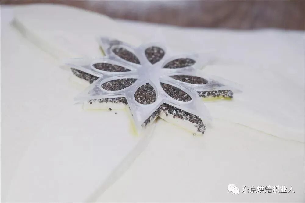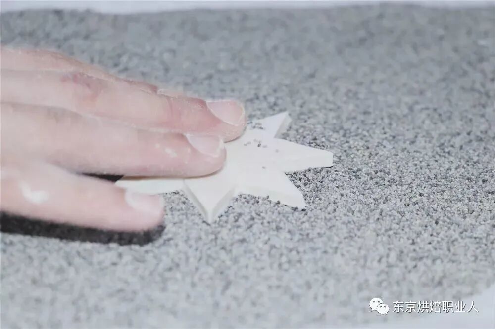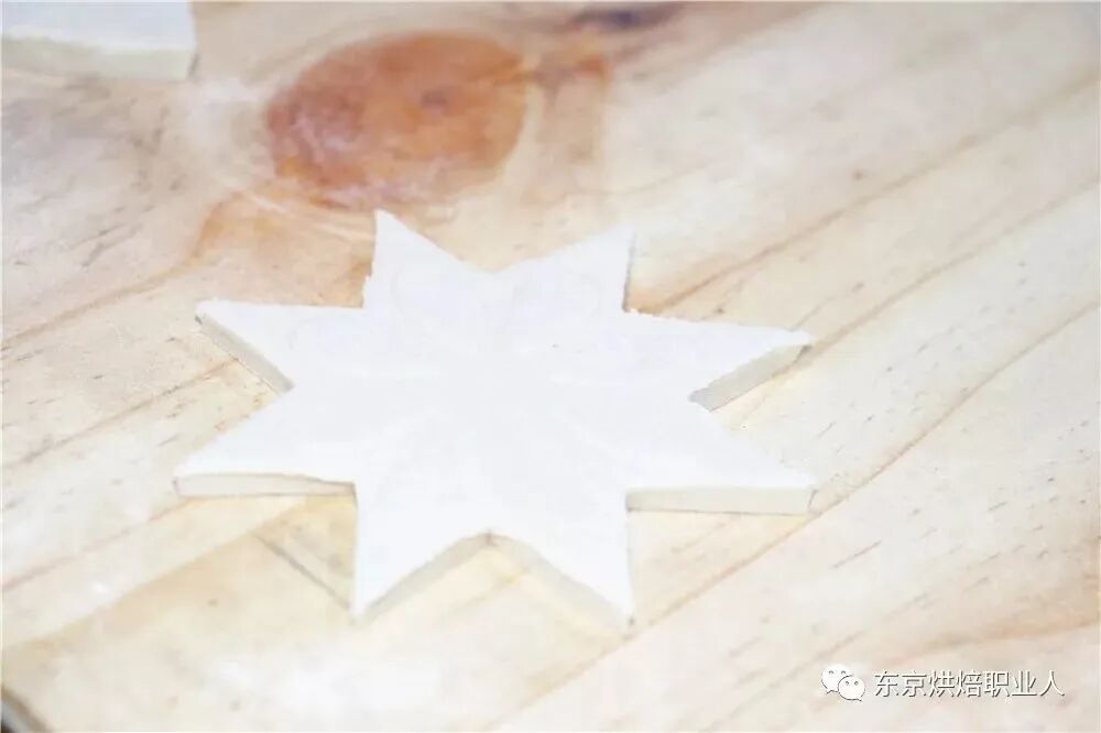 1、装饰 :烤前将八角花模具放在中间,筛低粉;