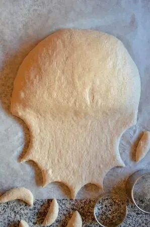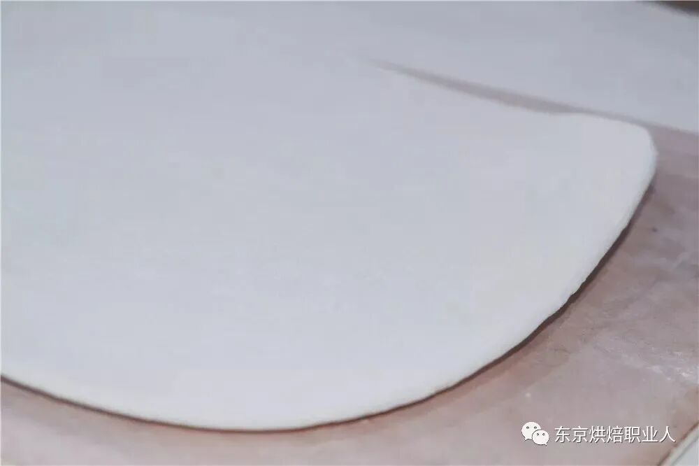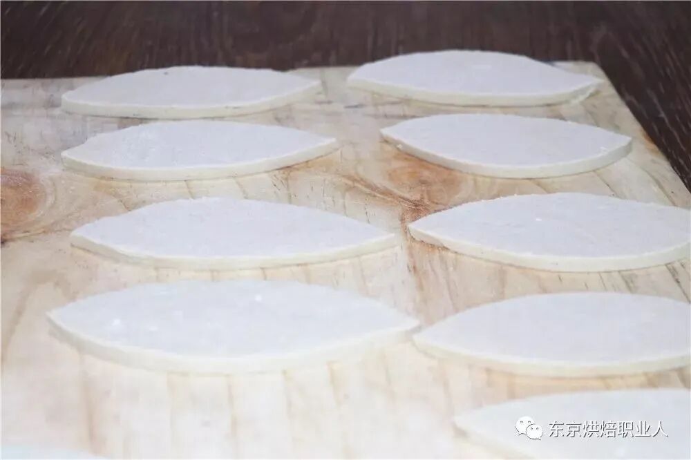 3、成型:面板上撒粉,取一个面团,用擀面杖在面团的1/2~1/3处,由中心向上擀开,擀成半圆形,大概3~4mm厚。