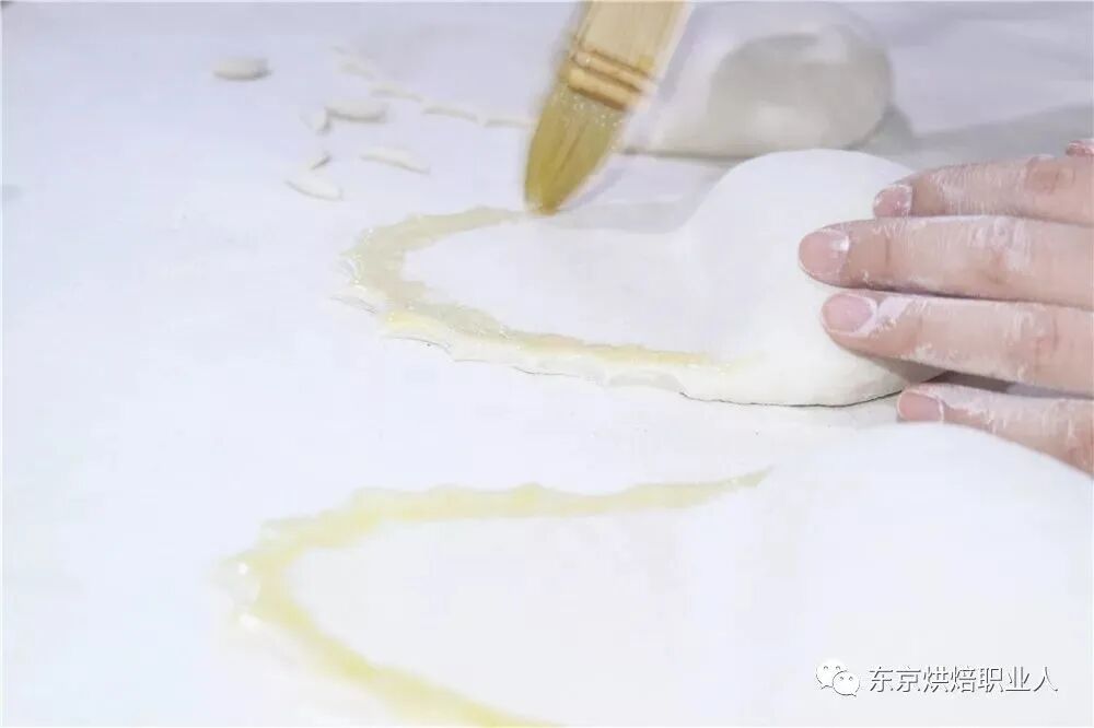 1、刷橄榄油的步骤一定不能少,橄榄油只要刷造型的边缘就可以。橄榄油使两片面团不能粘合在一起,起到分离的作用,烤出来的面包造型才会有飞翔的感觉。