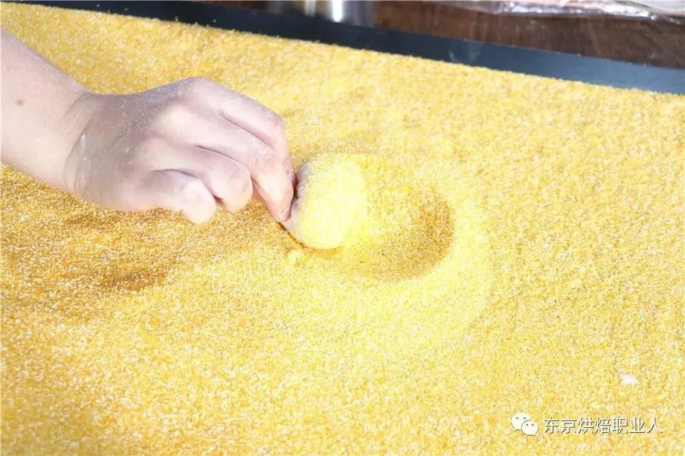 6、将50g面团揉圆,表面喷上水,沾上玉米碎;
