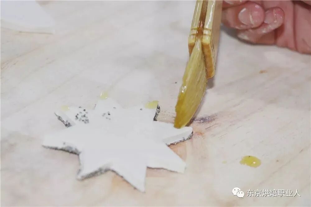 4、八角花刷上水,沾罂粟籽,沾好之后与叶子面团一起放冷冻备用;