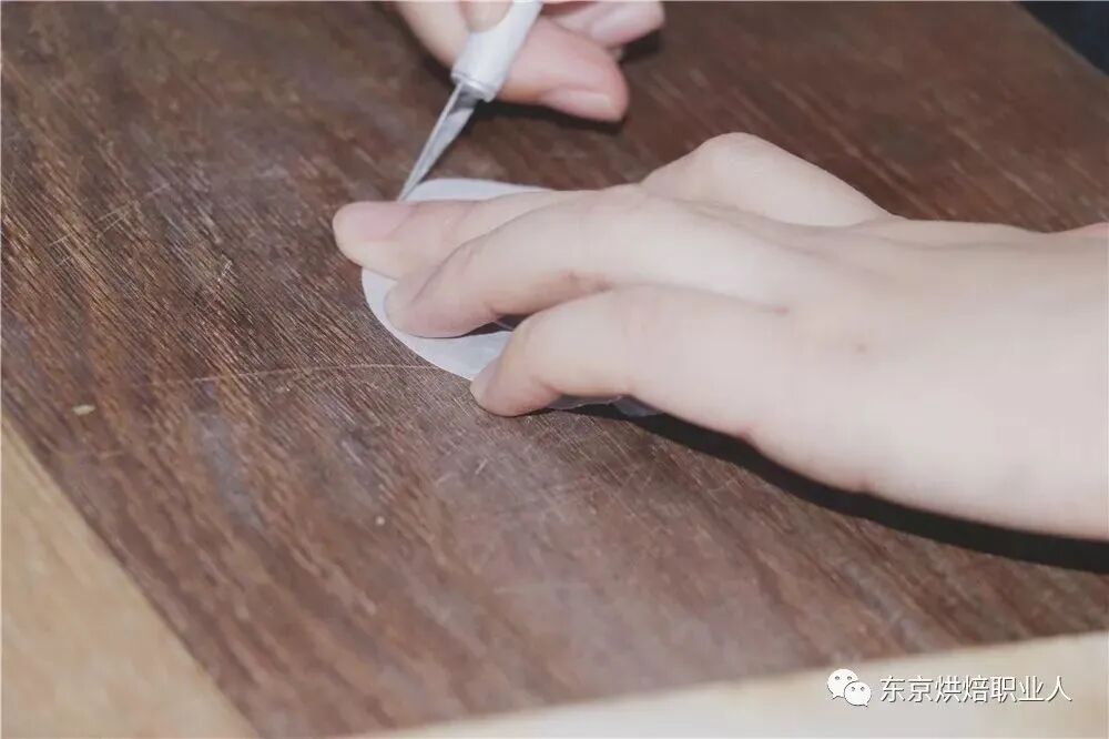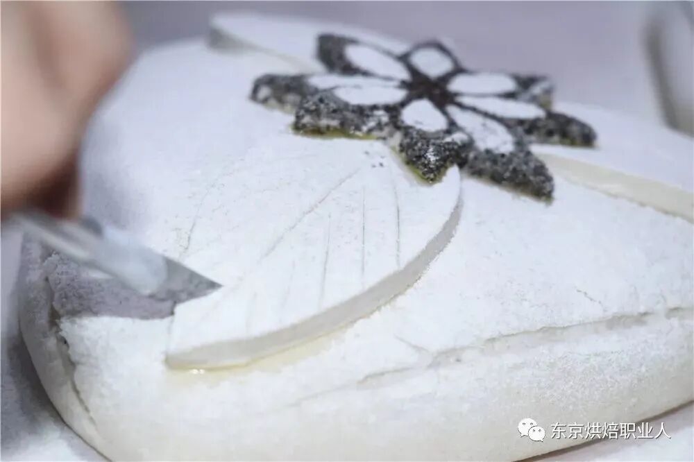 2、筛上一层低粉,用刀片划浅口,呈现“叶子”造型;