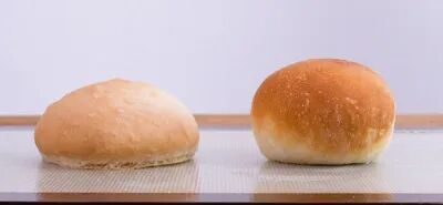 相同时间下,低筋面粉没有向上隆起很多,而是向四周展开。高筋面粉则是向上高高鼓起。