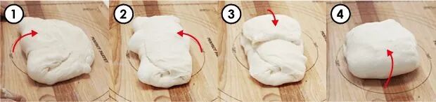 也可以用刮刀翻面(适用于含水量大的面团),用刮刀将面团的四周抬起来折向中心,直到将面团周围一圈全部折向中心。