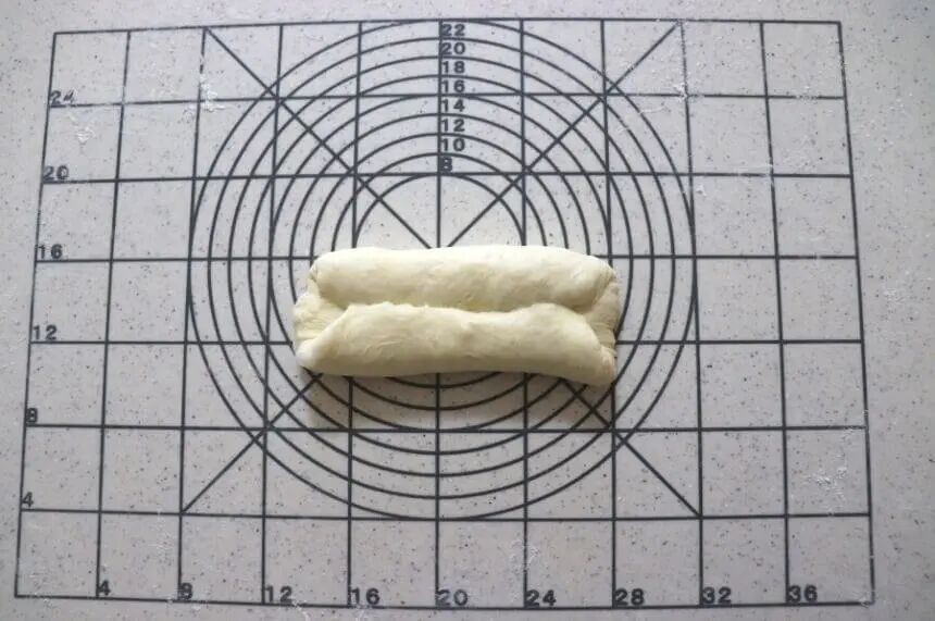 用擀面杖擀开的面团,左右两边向中间对折,松弛15分钟左右,然后再进行对着,放入模具。