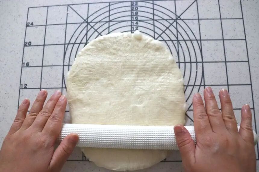 成型的时候,用擀面杖把面糊擀开,面糊就会被抽干,气泡也会被均匀地分散。