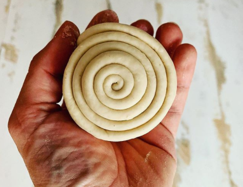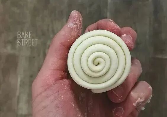 把面团擀开成方形,左右折叠,再擀开,反转再左右折叠。重复这样的操作擀至面团光滑柔软。最后,将面团擀长卷起为毛巾卷(又称蜗牛卷)。