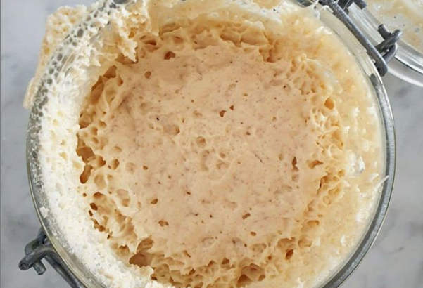 如果你在底部除了水,发现一层白色絮状物,意味着酵种已经开始瓦解。这时必须小心,否则它会变得流动性非常强,造成面团无法取出,将会流失掉很多。