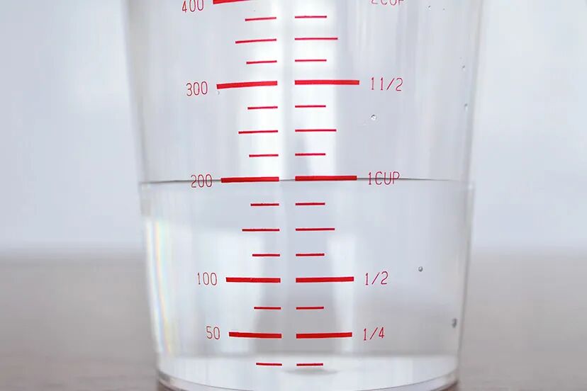 如果从上方看量杯,会比从侧面看时要少5到10毫升。