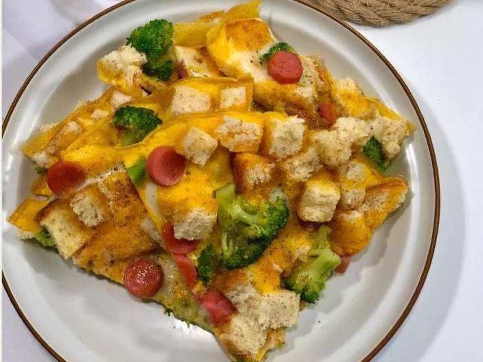 2.西兰花焯水,锅中刷油倒入全部食材(不含鸡蛋液),加一点盐,半勺生抽,翻炒,平铺锅底,倒入鸡蛋液,转小火,闷2分钟即可。