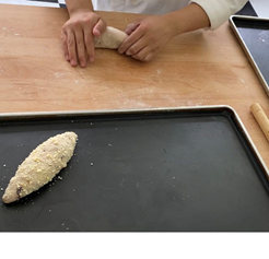 5.软欧面包的烤前装饰方法:筛低粉、剪刀口、挤馅料等(馅料不可以挤太多,也会造成面包比较扁)。