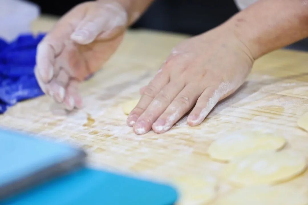 可用成型机或擀面杖将面团中的气泡擀压均匀,面团整体气泡均匀距离均等,在成形过程中进行面团的薄层化是很有必要的。