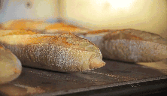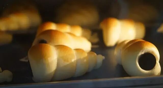 随着面包多余的水份大部分都已蒸发,面包完成了烘烤加热状态。
