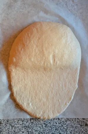 5、整型:面板上撒粉,取一个面团,用擀面杖在面团的1/2~1/3处,由中心向上擀开,擀成半圆形,大概3~4mm厚。