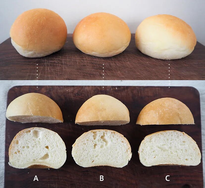 但是,由于沾在面团上的水分过多,导致面包变厚变硬。喷水的目的是为了散发出面团的香味和轻盈感,使用烤炉的蒸汽功能。从外观和口感方面来看,b是最好的。