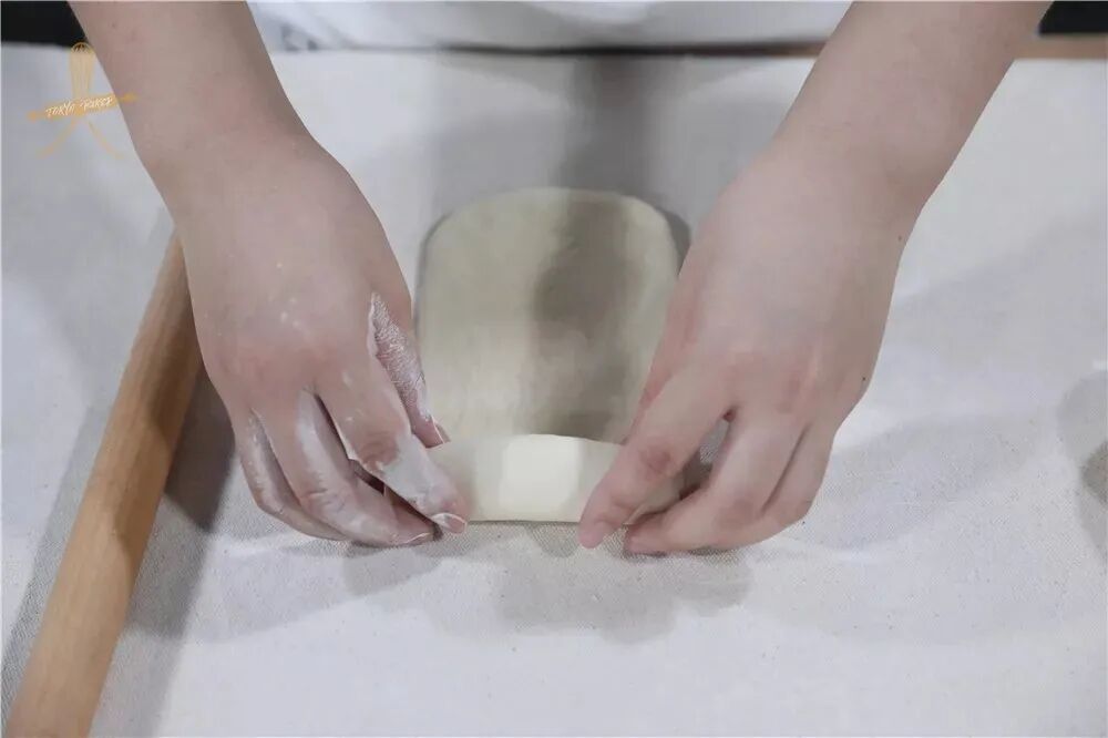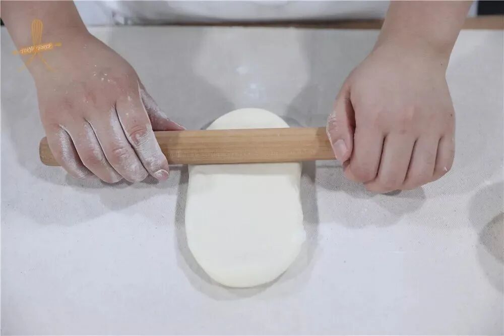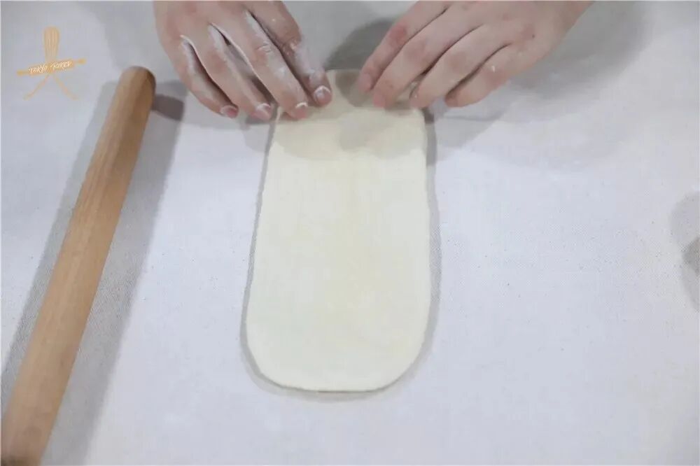 6、将面团擀开呈牛舌状、翻面、从上到下卷起。