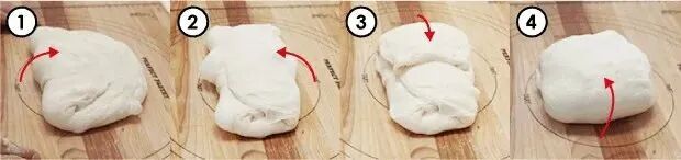 翻面是在第一次发酵时间到大概一半左右时进行,将面团倒在案板上将四边的面团向内折叠后继续发酵。