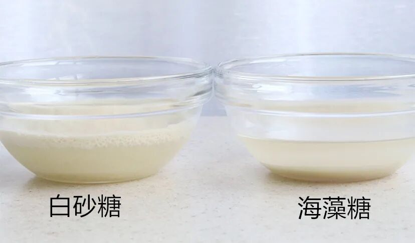 可以看到白砂糖碗有很多气泡,说明酵母正在发酵。而海藻糖碗没有肉眼可见的气泡,说明发酵极其缓慢。