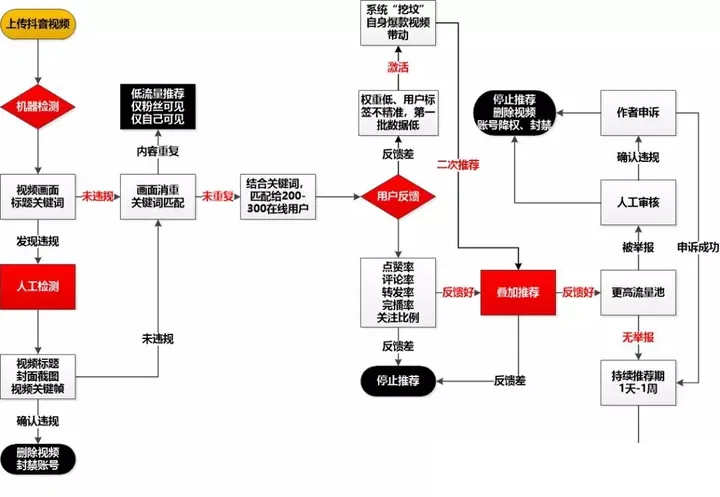 当你发布一条抖音时,首先机器会进行第一轮审核,检查你的作品、文案中是否有违规内容,然后再与抖音大数据库中的已存在的海量作品进行匹配消重,发现内容重复或者违规的内容,就进行小面积、低流量的推荐。
