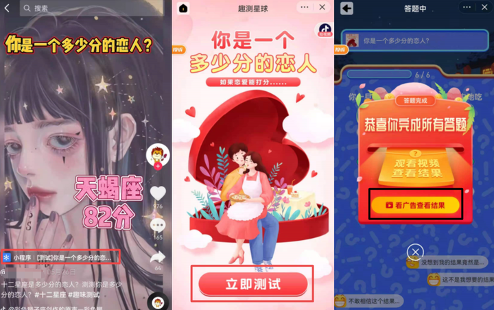 比如说这个星座测试,用户点击小程序之后,测试完必须要看视频广告才能查看结果。