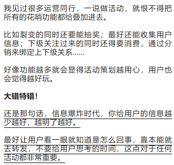 期间可以把活动排行榜释放出来,让粉丝查看自己的实时排名,通过这种方式间接激励他持续拉新这就足够了,千万不要在活动基础上去叠加太多的功能。否则,结果一定是出力不讨好。