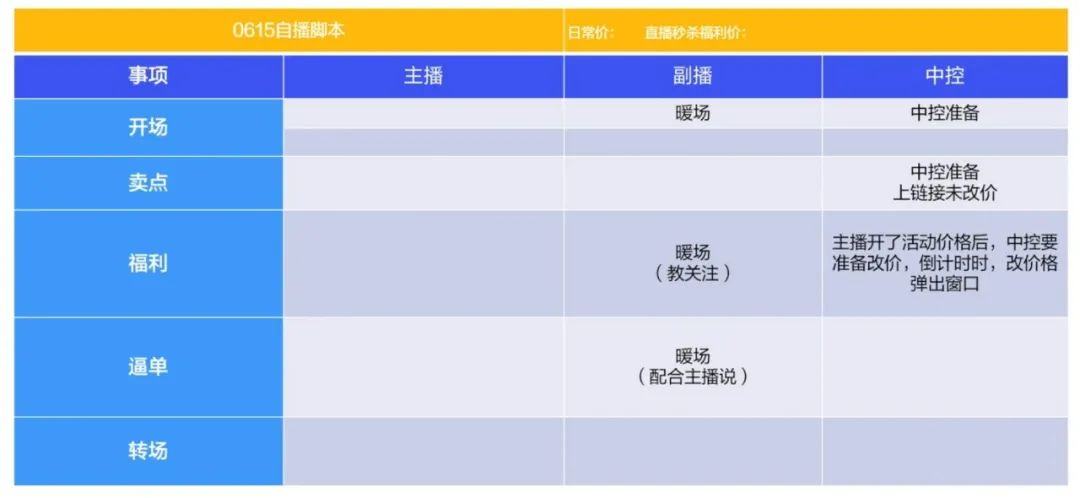 然后再做一个非常简单非常直观的分工脚本。每个岗位在直播流程中清楚做什么事情,注意的要点。