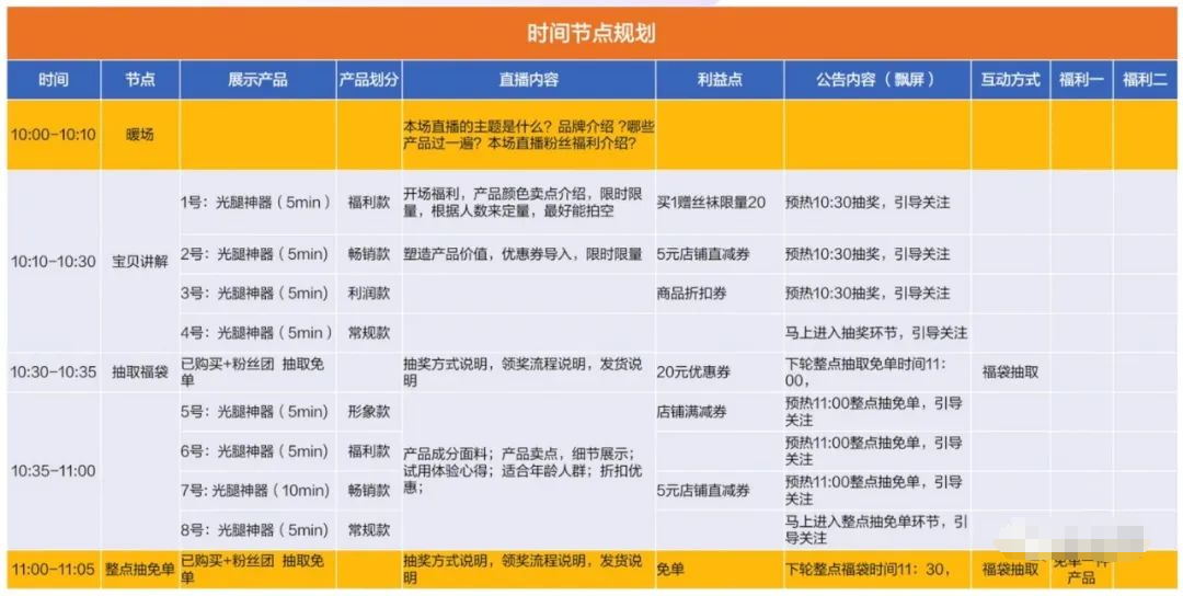 时间节点包括:暖场、产品讲解、过款动作、粉丝福袋、整点免单等,这些都是按时间轴做一些直播相关的工作。